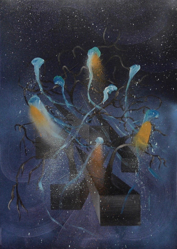 Growing in the Dark/Pimeässä kasvavat 2019, Acrylic and spray on canvas/Akryyli ja spray kankaalle, 70×50 cm Tykkää Lataa...