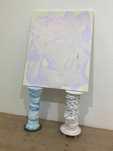 2024, acrylic on canvas, recycled materials, concrete, plywood / akryyli kankaalle, kierrätysmateriaalit, betoni, vaneri, 160 x 80 x 30 cm